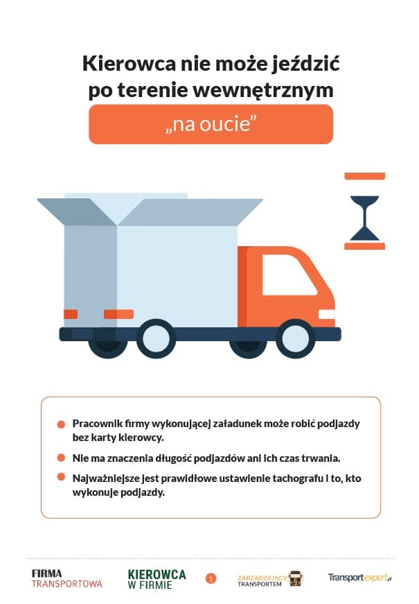 Kierowcy zawodowemu nie wolno wykonywać podjazdów pod rampę na terenie firmy „na oucie”. Może to robić wyłącznie inna osoba, która nie ma karty do tachografu. Pobierz grafikę wyjaśniającą zasady używania tachografu poruszając się po teremie zamkniętym.