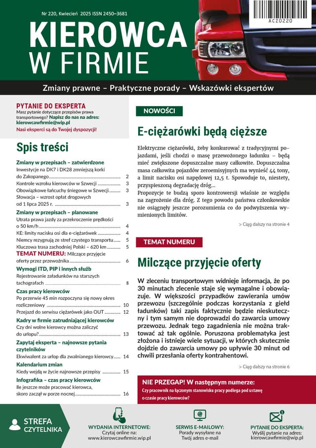 W zleceniu transportowym widnieje informacja, że po 30 minutach zlecenie staje się wymagalne i obowiązuje. W większości przypadków zawierania umów przewozu (szczególnie podczas korzystania z giełd ładunków) taki zapis faktycznie będzie nieskuteczny i tym samym nie doprowadzi do zawarcia umowy przewozu. Jednak tego zagadnienia nie można traktowaćaż tak ogólnie. Poruszona problematyka jest złożona i istnieje wiele sytuacji, w których skutecznie dojdzie do zawarcia umowy po upływie 30 minut od chwili przesłania oferty kontrahentowi.