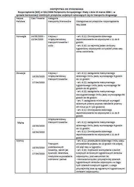 ODSTĘPSTWA OD STOSOWANIA Rozporządzenia (WE) nr 561/2006 Parlamentu Europejskiego i Rady z dnia 15 marca 2006 r. w sprawie harmonizacji niektórych przepisów socjalnych odnoszących się do transportu drogowego